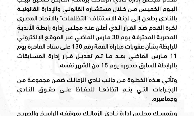 تقدم مجلس إدارة نادي الزمالك برئاسة الكابتن حسين لبيب اليوم الخميس من خلال مستشاره القانوني والإدارة القانونية بالنادي بطعن إلى لجنة الاستئناف “التظلمات” بالاتحاد المصري لكرة القدم ضد القرار الذي أعلن عنه مجلس إدارة رابطة الأندية المصرية المحترفة يوم 30 مارس الماضي عبر الموقع الإلكتروني للرابطة بشأن عقوبات مباراة القمة رقم 130 على ستاد القاهرة يوم 11 مارس الماضي بعد ما تم تعديل قرار إدارة المسابقات بالرابطة السابق صدوره يوم 15 من الشهر نفسه