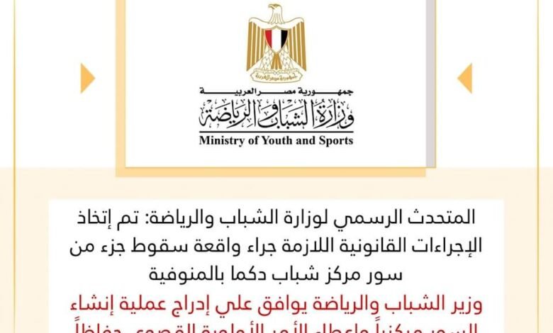 المتحدث الرسمي : تم إتخاذ الإجراءات القانونية اللازمة جراء واقعة سقوط جزء من سور مركز شباب دكما بالمنوفية