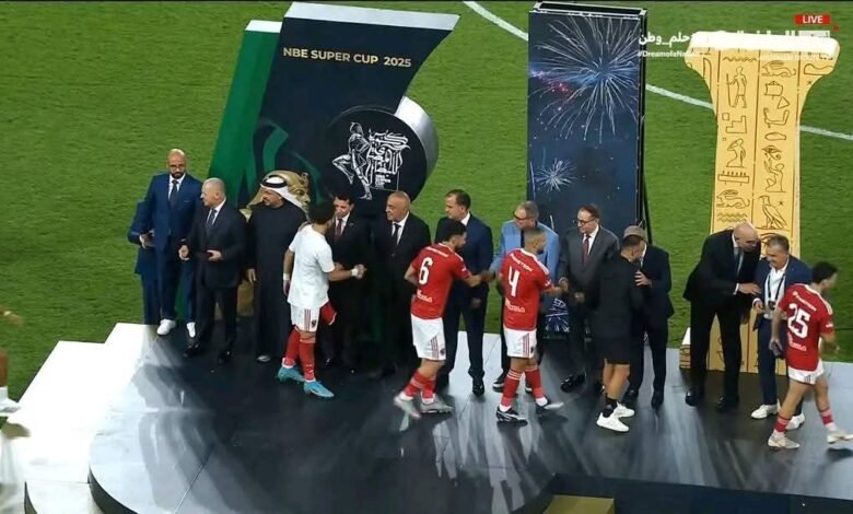 بالصور زيزو يرفض السلام على هشام نصر نائب رئيس نادي الزمالك على المنصة .. وهشام نصر يشكو لخالد مرتجي أمين صندوق الأهلي ما حدث