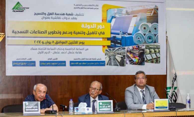 وأشاد نقيب المهندسين باهتمام شعبة الغزل والنسيج بإنقاذ الصناعات النسيجية، ودعا جميع الشُّعب الهندسية أن تحذو حذوها.. وقال: “شعبة الغزل والنسيج قامت بدور وطني ونقابي عظيم حينما تبنت إنقاذ الصناعة النسيجية، وعلى الشُّعب الهندسية المختلفة أن تسير في ذات الاتجاه، كلٌّ في مجاله لوضع روشتة كاملة لإنقاذ جميع الصناعات، وسنقدم هذه الروشتة لكل الجهات المسئولة مساهمة من النقابة في تطوير الصناعات المصرية”.