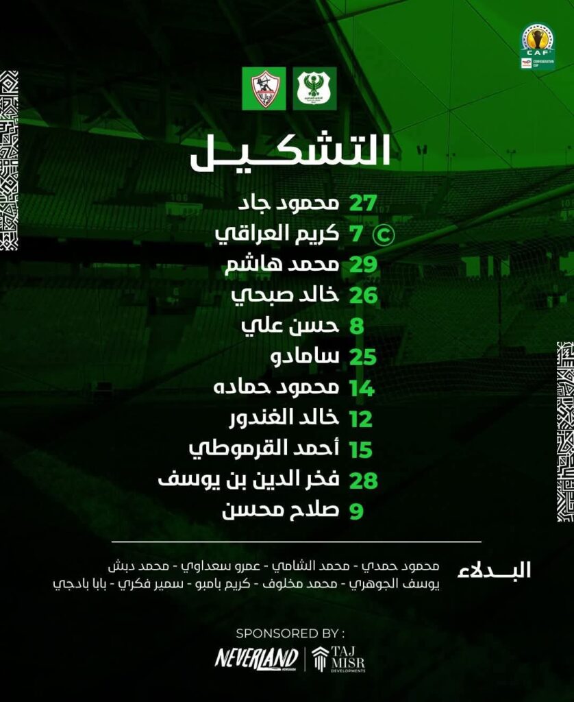 ويتواجد على مقاعد البدلاء، محمد صبحي وحمزة المثلوثي وأحمد محمود ومحمد عاطف وكونراد ميشالاك ومحمود عبد الرازق”شيكابالا” وسيف الجزيري وعمر فرج وناصر منسي.