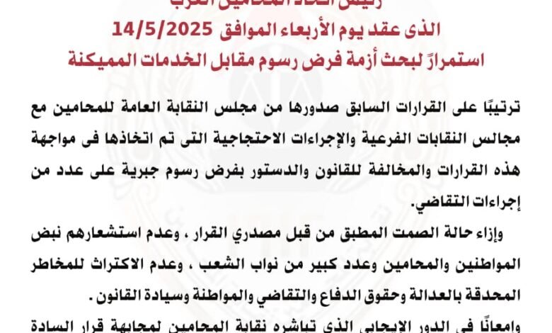 ترتيبًا على القرارات السابق صدورها من مجلس النقابة العامة للمحامين مع مجالس النقابات الفرعية والإجراءات الاحتجاجية التى تم اتخاذها فى مواجهة هذه القرارات والمخالفة للقانون والدستور بفرض رسوم جبرية على عدد من إجراءات التقاضي.