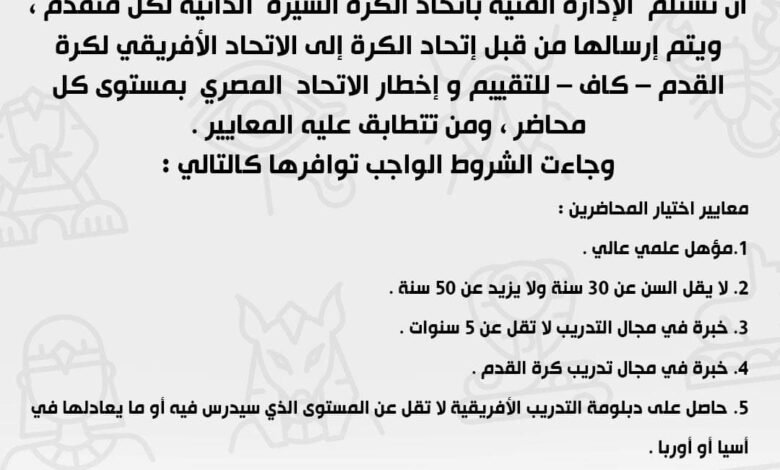 تقرر فتح باب التقديم للمحاضرين من ذوي المؤهلات العلمية على أن تستلم الإدارة الفنية باتحاد الكرة السيرة الذاتية لكل متقدم ، ويتم إرسالها من قبل إتحاد الكرة إلى الاتحاد الأفريقي لكرة القدم – كاف – للتقييم وإخطار الاتحاد المصري بمستوى كل محاضر ، ومن تتطابق عليه المعايير .