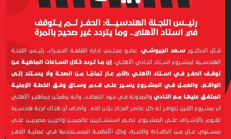 رئيس اللجنة الهندسية: الحفر لم يتوقف في استاد الأهلي.. وما يتردد غير صحيح بالمرة