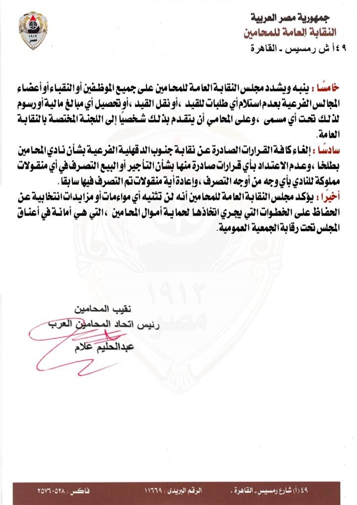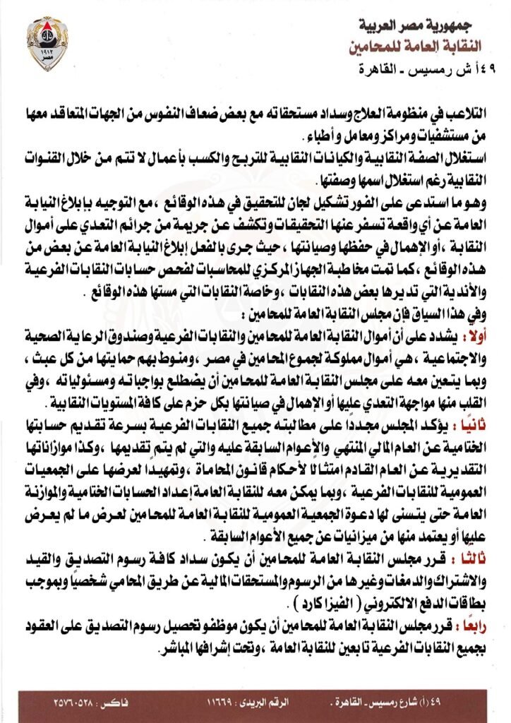 أولاً : يشدد على أن أموال النقابة العامة للمحامين والنقابات الفرعية وصندوق الرعاية الصحية والاجتماعية ، هي أموال مملوكة لجموع المحامين في مصر ، ومنوط بهم حمايتها من كل عبث، وبما يتعين معه على مجلس النقابة العامة للمحامين أن يضطلع بواجباته ومسئولياته ، وفي القلب منها مواجهة التعدي عليها أو الإهمال في صيانتها بكل حزم على كافة المستويات النقابية .