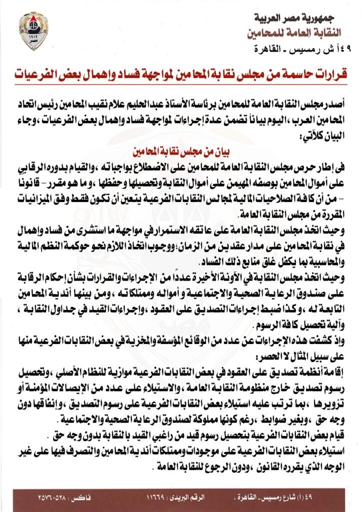 أصدر مجلس النقابة العامة للمحامين برئاسة عبدالحليم علام نقيب المحامين رئيس اتحاد المحامين العرب، اليوم بياناً تضمن عدة إجراءات لمواجهة فساد وإهمال بعض الفرعيات، وجاء البيان كلآتي: