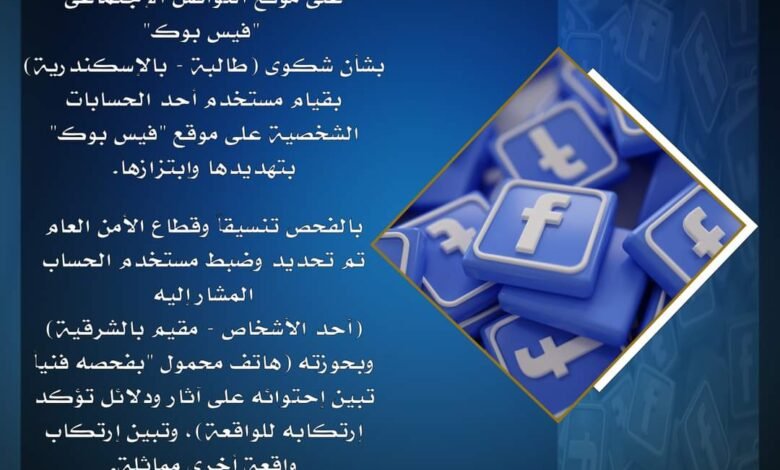 كشف ملابسات ما تم تداوله على موقع التواصل الإجتماعى “فيس بوك” بشأن شكوى (طالبة – بالإسكندرية) بقيام مستخدم أحد الحسابات الشخصية على موقع “فيس بوك” بتهديدها وإبتزازها.