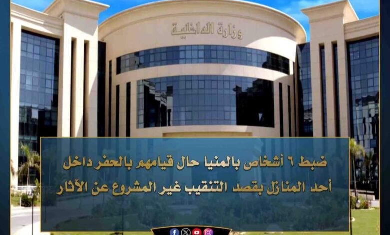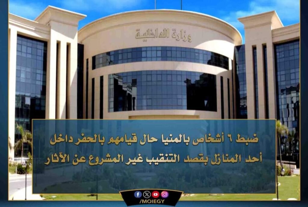 بالإنتقال والفحص تنسيقاً وقطاع الأمن العام تم ضبط مالك المنزل وبصحبته (5 عمال – مقيمون بدائرتى مركزى شرطة “العدوة، مغاغة”).. حال قيامهم بالحفر والتنقيب عن الآثار داخل المنزل محل البلاغ وعثر على (حفرة دائرية بإحدى الغرف بعمق 5 أمتار تقريباً – الأدوات المستخدمة فـى الحفر).
