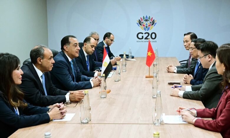 على هامش مشاركته نيابة عن فخامة السيد الرئيس عبد الفتاح السيسي، رئيس الجمهورية، في قمة مجموعة العشرين (G20) لعام 2025 بمدينة “جوهانسبرج” في جنوب أفريقيا، التقى الدكتور مصطفى مدبولي، رئيس مجلس الوزراء، اليوم، فام مينه تشين، رئيس وزراء فيتنام، وذلك بحضور الدكتور بدر عبد العاطي، وزير الخارجية والهجرة وشئون المصريين بالخارج، والسفير/ أحمد علي شريف، سفير مصر في جنوب أفريقيا.