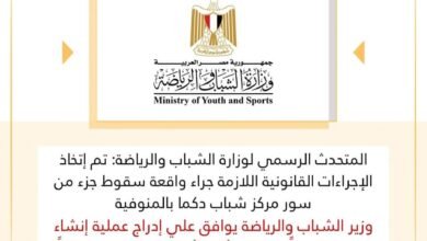 المتحدث الرسمي : تم إتخاذ الإجراءات القانونية اللازمة جراء واقعة سقوط جزء من سور مركز شباب دكما بالمنوفية