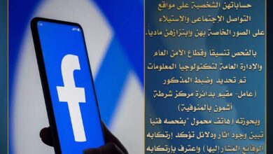 وزارة الداخلية كشف ملابسات تضرر عدد من السيدات من شخص بإختراق حساباتهن الشخصية بأشمون